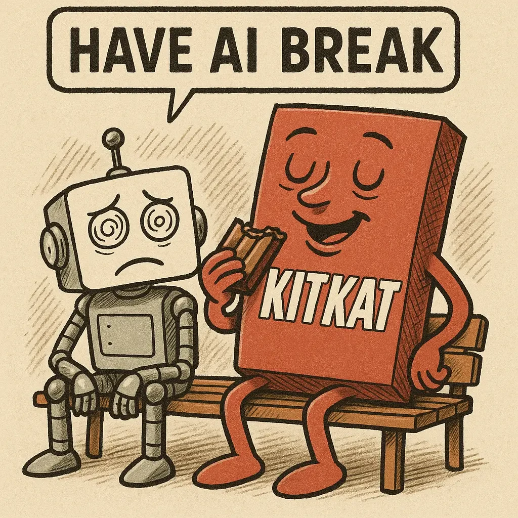 After the noise around “Break From Politeness,” KitKat’s wider AI platform leaned into a much safer — and honestly, stronger — angle: “Have AI Break”. Instead of telling people how to behave with AI, the global work reframes the story around KitKat’s core promise: everyone needs a break — even the machines.